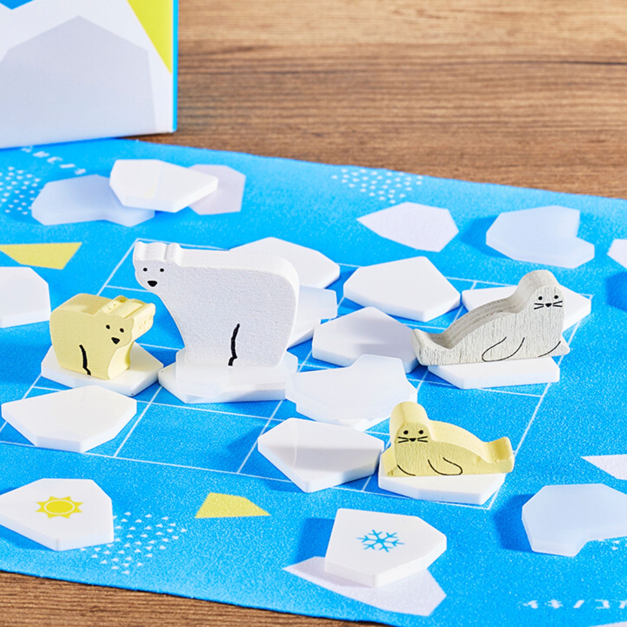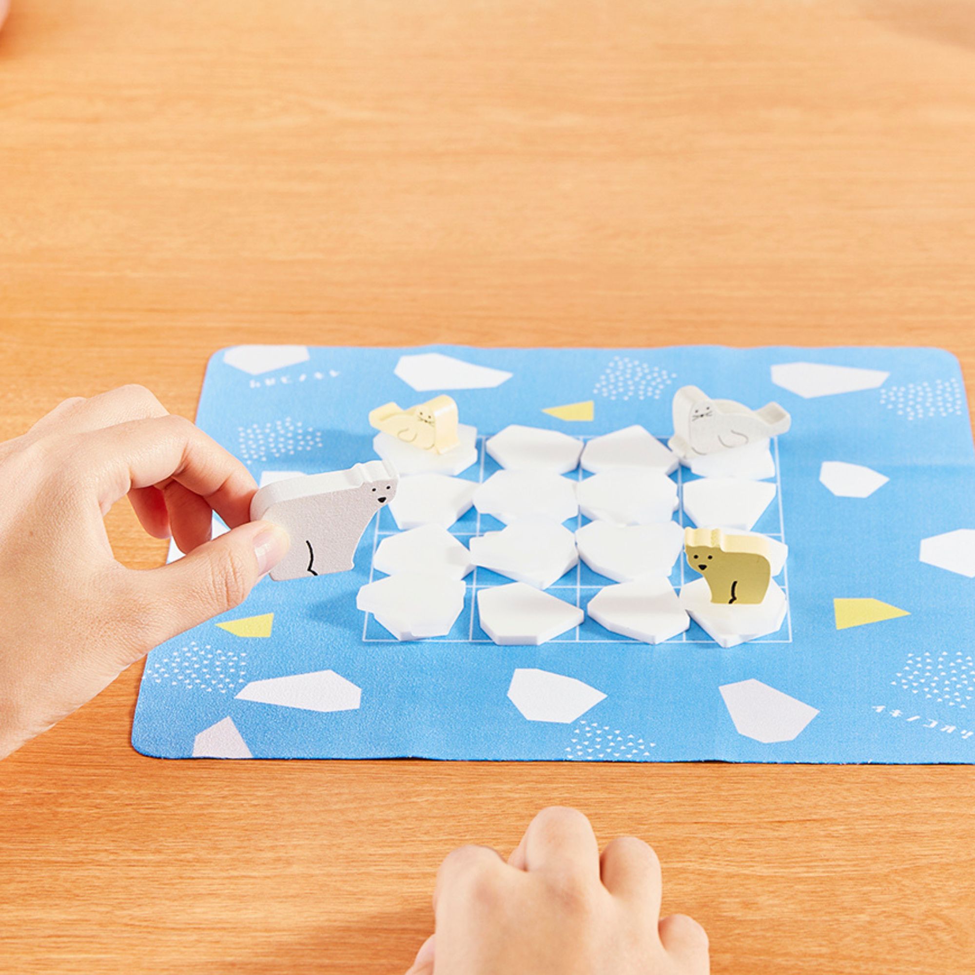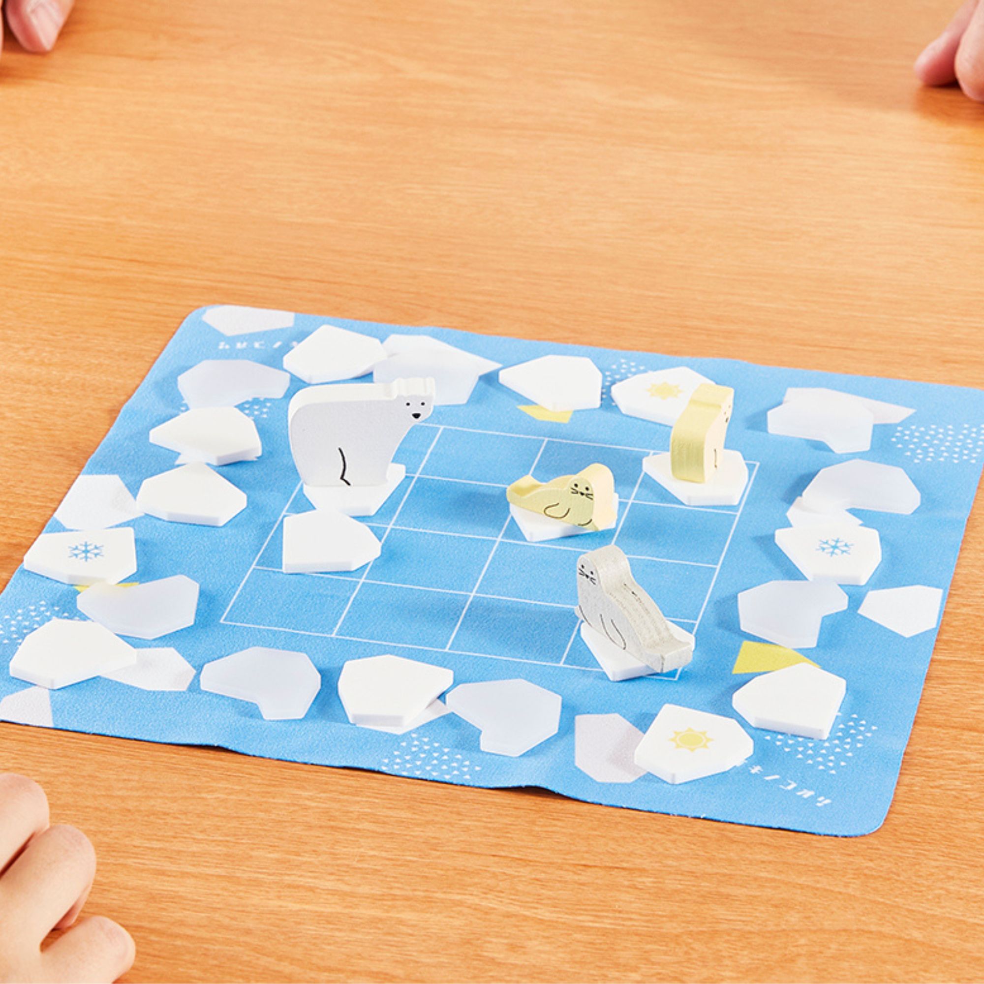 IKINOKOORI. This is a story set in the Arctic. Ice is melting. All players choose an animal piece — polar bear, a polar cub, a seal or a seal pup. Try to move cleverly on the solid ground. The player who can move on the ice tiles until the end is the winner.